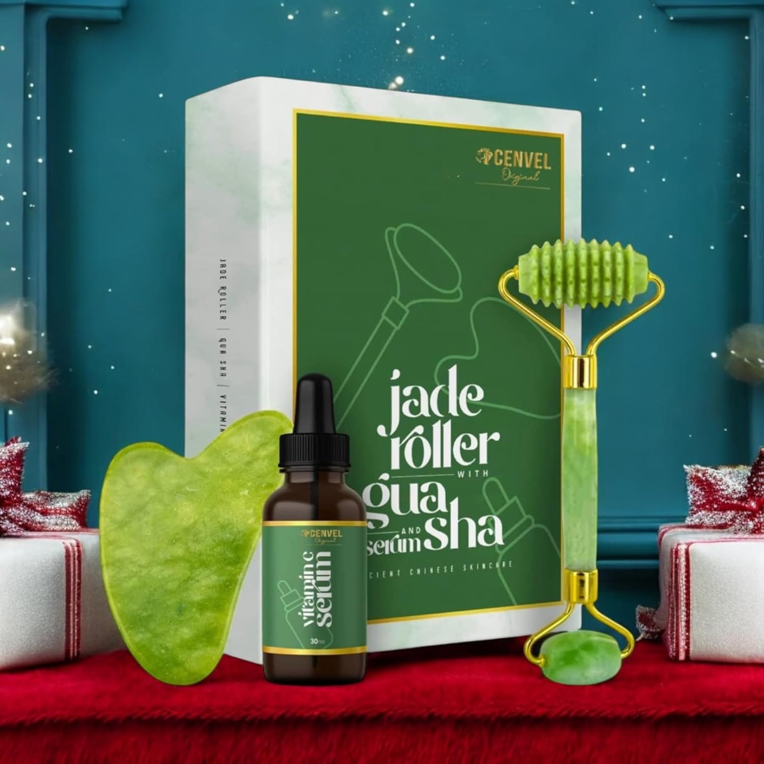 100% Real Crystal Jade Stone Roller and Gua Sha Set with Vitamin C Serum | Great for Eye Puffiness Treatment, Skin Tightening, Anti Aging, Rejuvenate Face & Neck | Great Gift for Women & Men (Green)